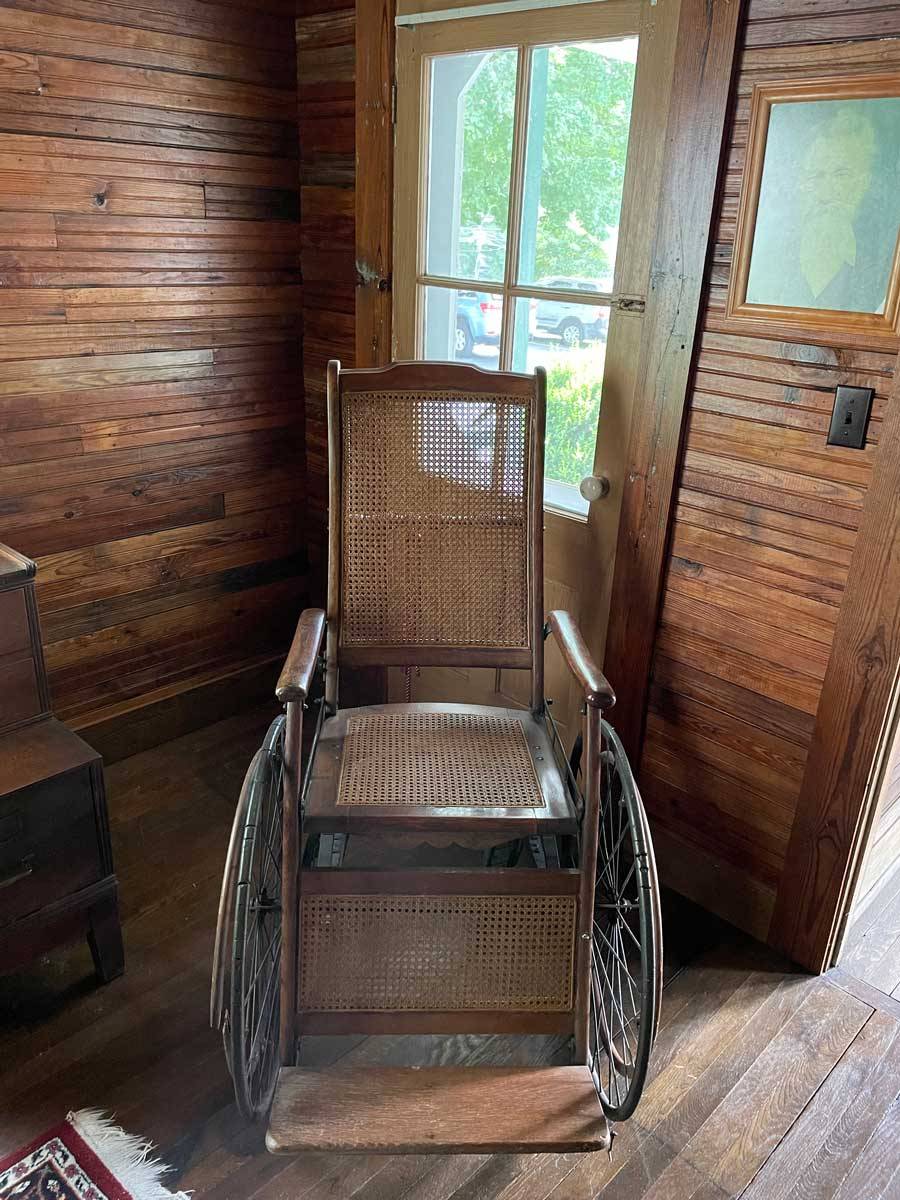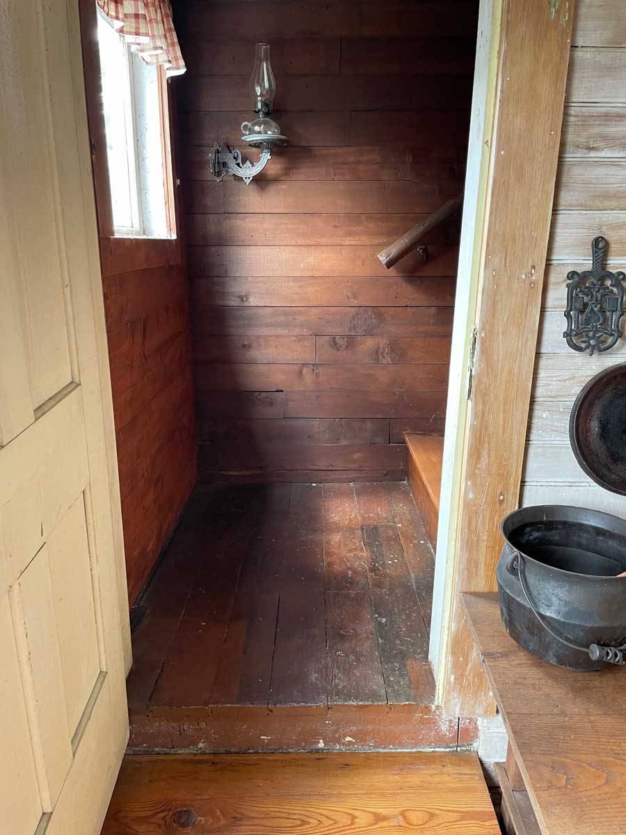 The only bathroom in the house is located on the second floor of the rear ell at the top of the front stairs. It adjoins the back bedroom. Both rooms are accessed by a narrow hallway. In the northwest corner of the back bedroom stands a historic Columbus wood-saver stove, vented through metal thimbles into the stuccoed brick chimney. Like the three front second-story bedrooms, the walls and ceiling of the back bedroom are wood lath and brown sheathing paper, but the floor is laid with narrow, tongue-and-groove maple boards. The door is like that of the two front bedrooms and the cellar door. The bathroom floor is covered with two-and-a-fourth-inch pine boards. The walls are beaded poplar, aligned vertically. The porcelain-over-cast-iron wall-hung sink is surmounted by recessed shelves. The sink and cast-iron pedestal tub with round rim and the sink in the kitchen are the few remaining historic furnishings in the house.
