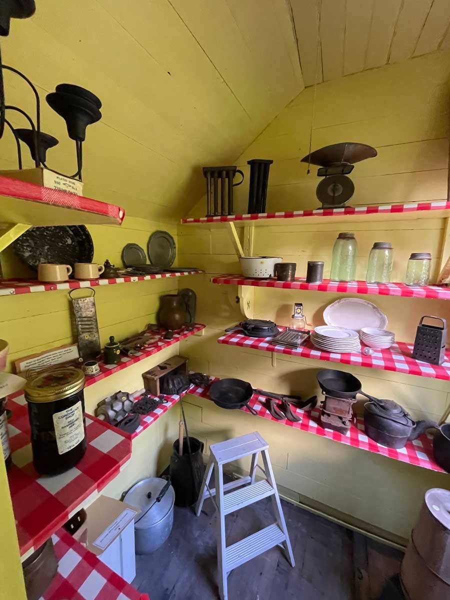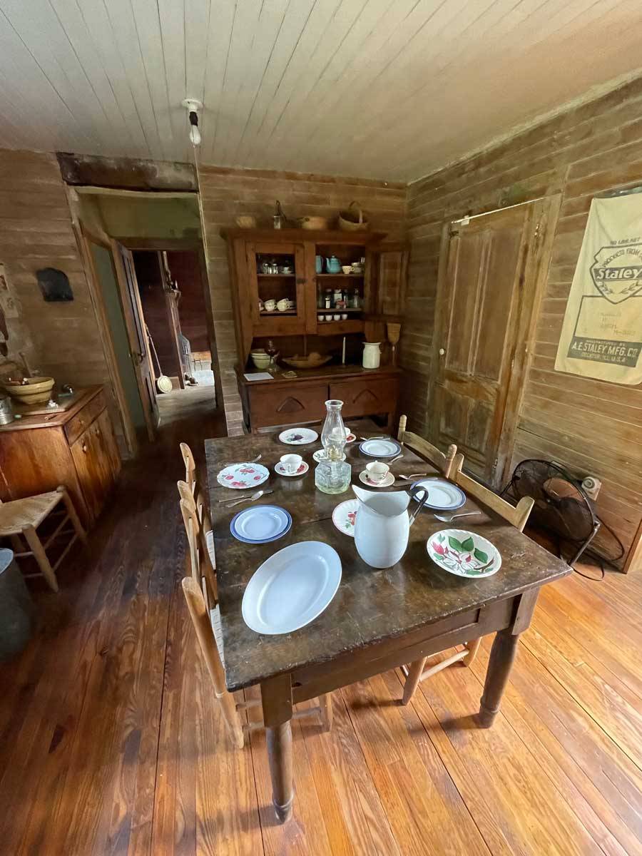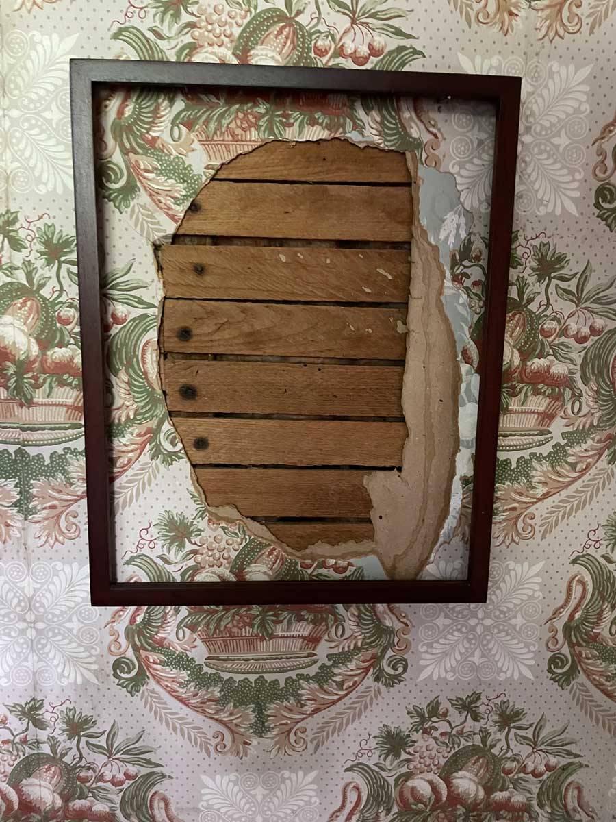 The dining room walls are covered with lath, brown and gray sheathing paper, and flower pattern wallpaper. These layers can be seen where the Historical Society framed an opening, rather than repair it, to illustrate the original structure. The ceiling is beadboard. A second opening in the southwest corner of the room allows direct unobstructed access to the kitchen through the short hall. Whether this doorway ever contained a door is not known, since it shows no signs of hinge cuts and the adjacent entrance into the hall and kitchen are cased openings only.
