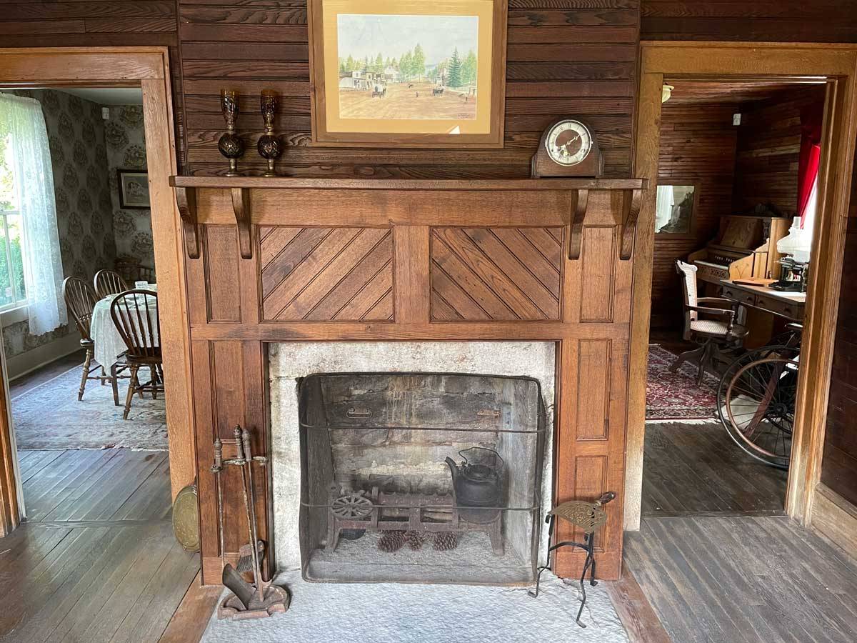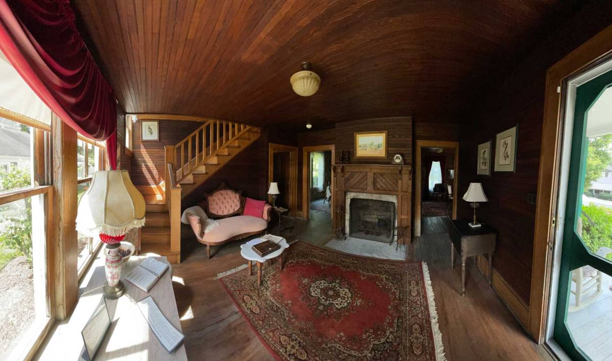 On entry into the house, the walls and ceiling of the parlor are covered with two-and-a-fourth-inch tongue-and-groove clear chestnut beadboard. The floor is laid with two-and-a-fourth-inch tongue-and-groove oak boards and is edged with eight-inch tall baseboard molding with a top bead. In the interior (north) wall on each side of the fireplace are doorways to a bedroom on the right and dining room on the left. Against the rear (west) wall of the parlor, a flight of stairs ascends to the upper story. Beneath these stairs is another stairway descending to the potato cellar. It is accessed at the northwest corner of the room through a doorway into a short hall. The cellar door is mortised, bears a white porcelain knob, and features four flat pine panels with square-edge stiles and rails. On the interior wall of the parlor a chestnut mantelpiece encloses a fireplace surround and hearth of dressed granite.