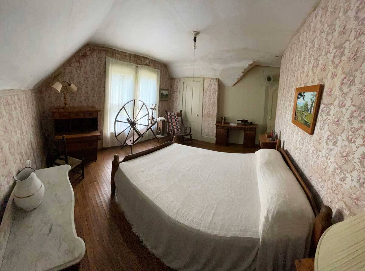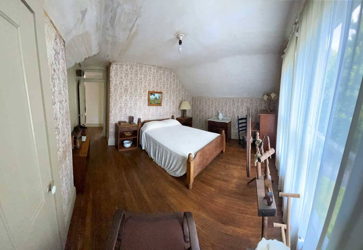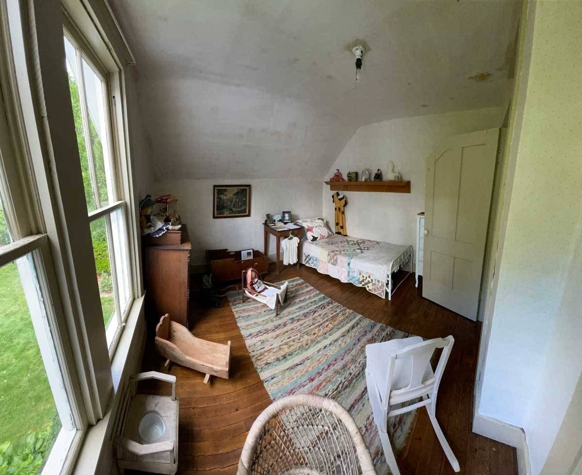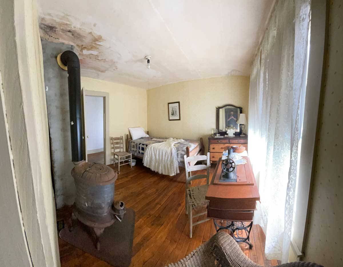 The walls and ceiling of the north bedroom are yellow pine beadboard. The floor features the same oak boards and baseboard of the parlor.