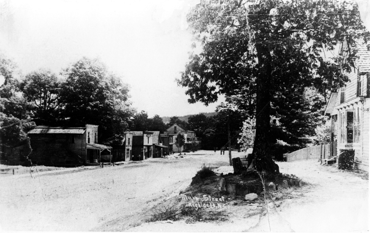 Main Street Highlands, looking east, in 1910. T. Baxter White's post office and home are on the right. On the left are Hiram Paul's dry goods store, Sinle Hood's quarters, W. T. Potts' livery stable, William B. Cleaveland's grocery, H. M. Bascom's hardware store, and Highlands House (now Highlands Inn). Photo by Henry Scadin.