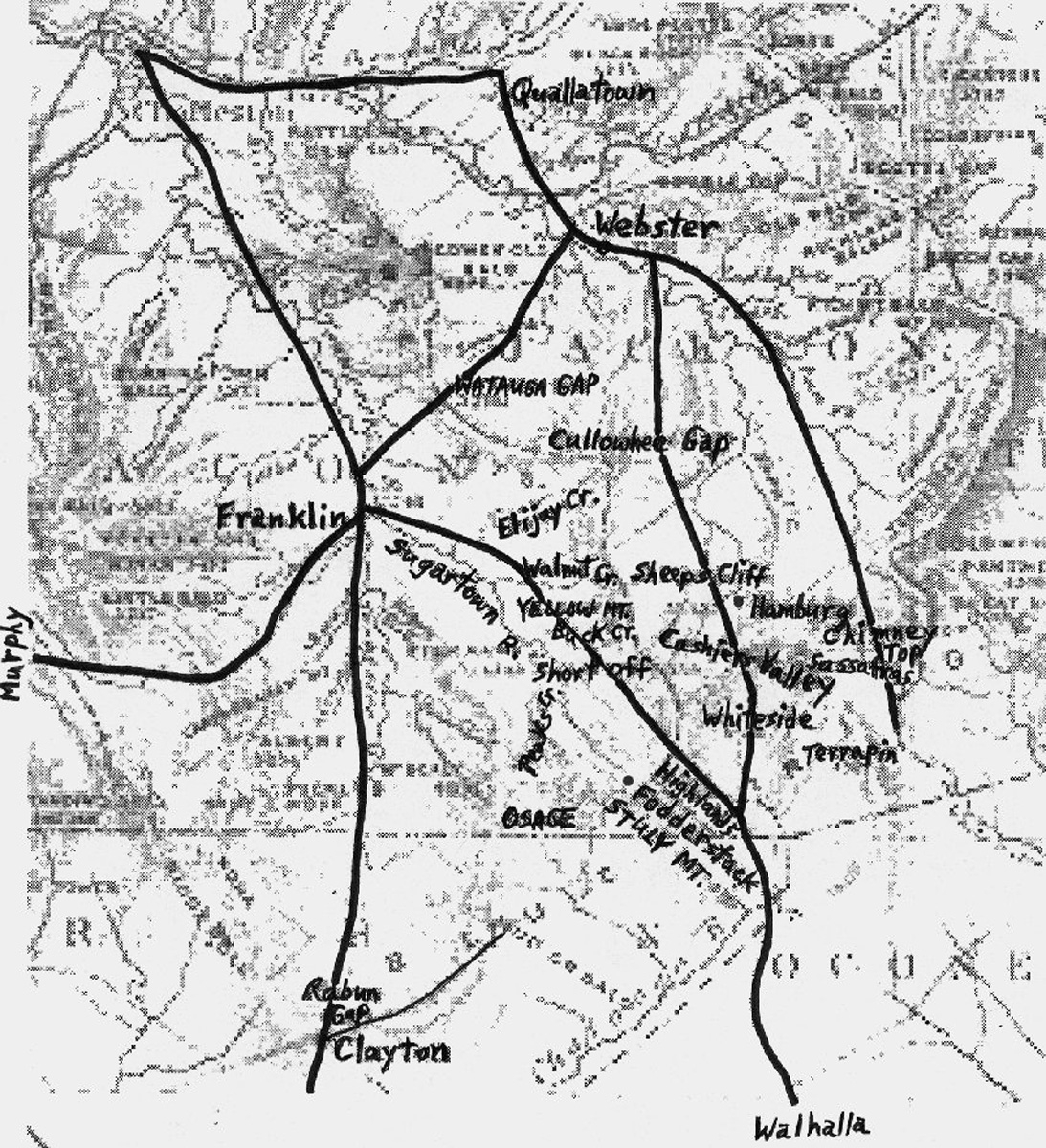 This road map of the Macon County area in 1882 not only shows Highlands at age seven years but also Stuly (Satulah) Mountain, Short Off, and Cashiers Valley. It shows the Highlands-Franklin road running out today's Flat Mountain Road, down Brushy Creek to Buck Creek, and over Moss Branch Road to Walnut Creek.