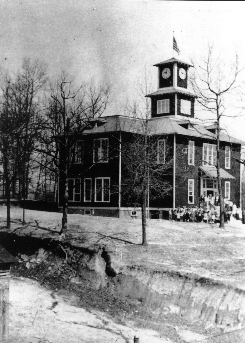 Photo of Town Clock School. It replaced Highlands Village School when it was built in 1916-19 on Knowledge Hill where the ABC Store stands today. All 6 schools in the Highlands District were consolidated into this building in 1928, and it crowned the town with its impressive architecture.