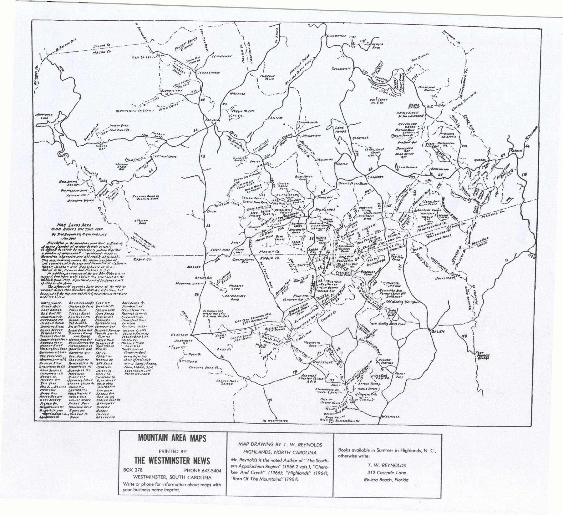 Two maps in 1966 were created by T. W. Reynolds, Highlands' first historian, showing all the roads, trails, and points of interest surrounding Highlands and Horse Cove, which he had discussed in his four books about the area. On the Highlands map he included a long list of odd names, such as Dirty John Creek, Lost Bridge, Screamer Mountain, Smash Wagon Ford, Misery Mountain, and Chunky Gal.