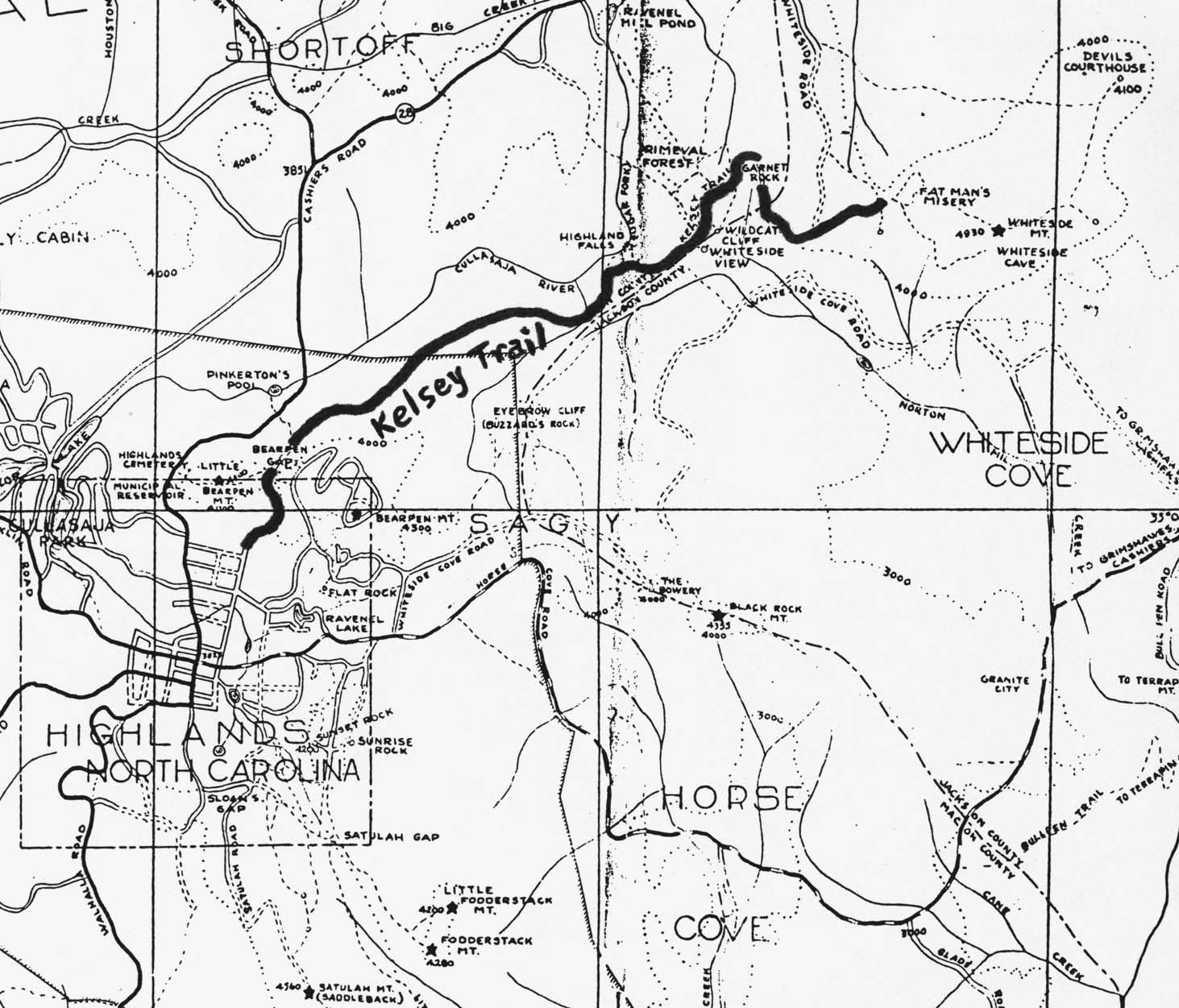 The Kesley Trail, which Samuel Kelsey built in 1883, ran from the end of 5th Street over Bear Pen Gap and through a primeval forest of 8-foot-in-diameter giant hemlocks for five miles to Whiteside Mountain, the highest cliffs east of the Rockies, plunging 1,800 feet to the headwaters of the Chattooga River. The trail featured Highlands Falls, Wildcat Cliff, and Garnet Rock and ended near Fat Man's Misery, Whiteside Caves, and Fool's Rock.